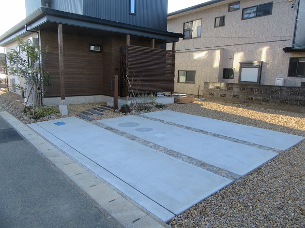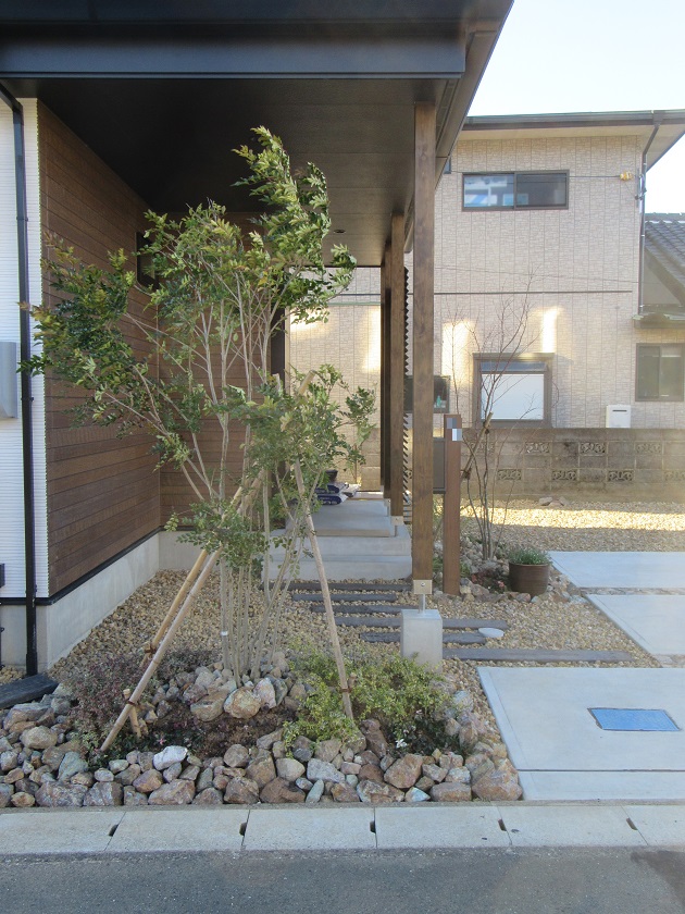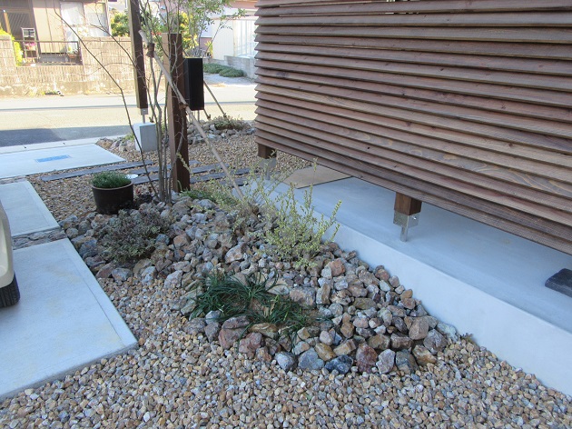 チャート石(岐阜砕石)をふんだんに使いました。敷地全体には小粒のチャート石、植栽スペースや土留めや駐車場目地には大粒のチャート石を入れました。