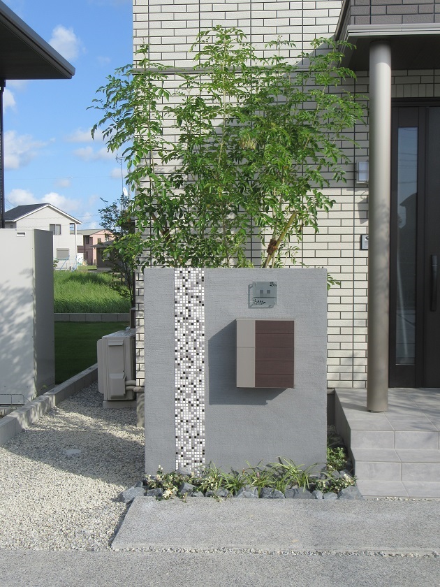 門袖と高木(シマトネリコ)。モザイクタイルをアクセントに。ポストは玄関ドアと同色の木調。