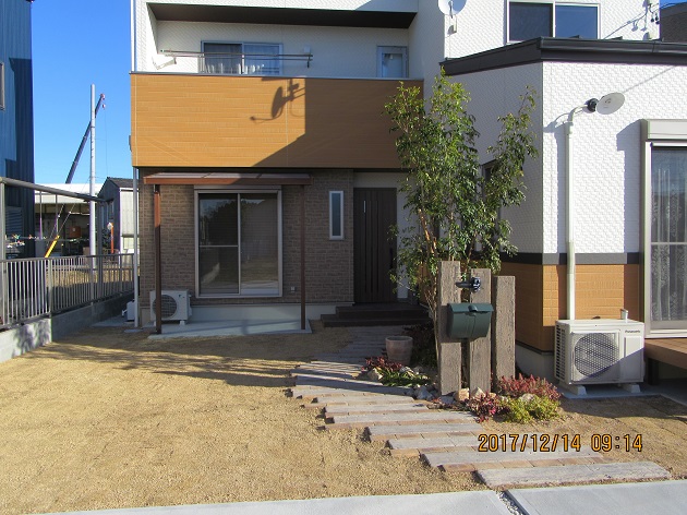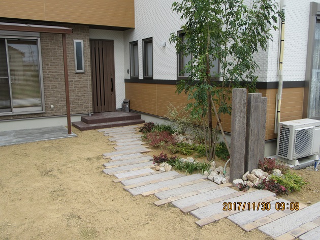 ポスト、表札、プランターがまだない未完成状態ですが、それ以外は完成しています。アプローチは枕木と、アンティークレンガを交互に配置。少し多めに植栽を入れ、遊歩道的な雰囲気を演出。残りは芝貼りです。高木はシマトネリコです。