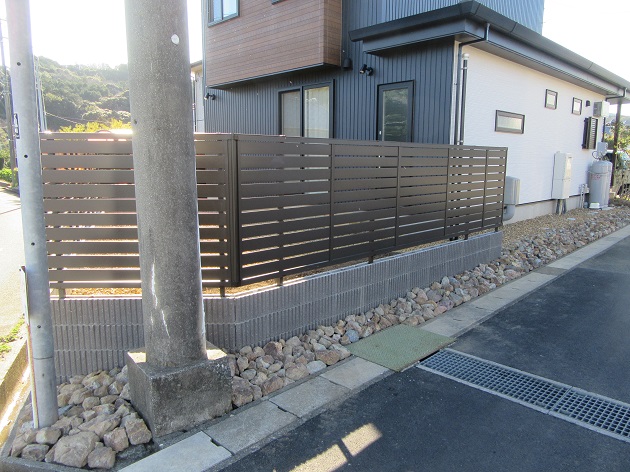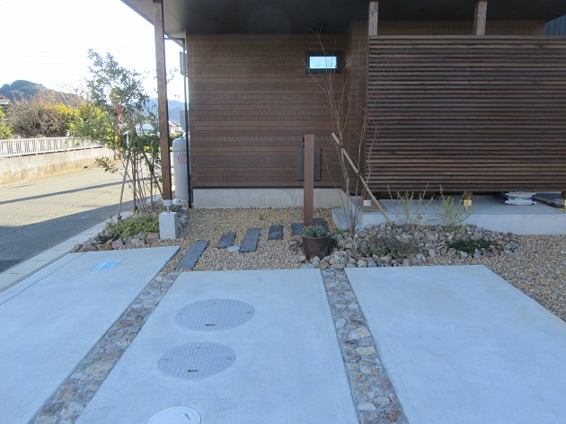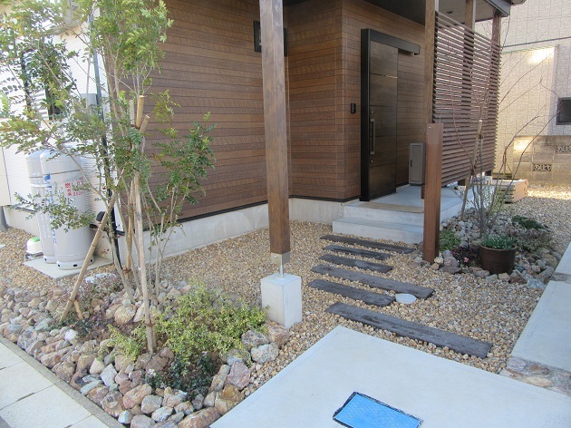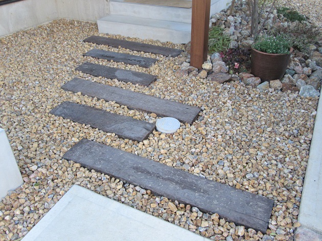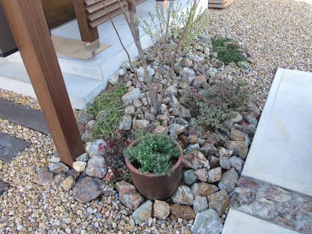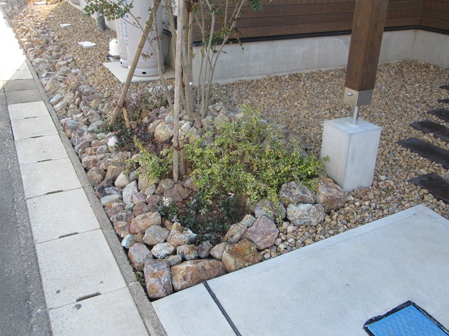チャート石(岐阜砕石)をふんだんに使いました。敷地全体には小粒のチャート石、植栽スペースや土留めや駐車場目地には大粒のチャート石を入れました。