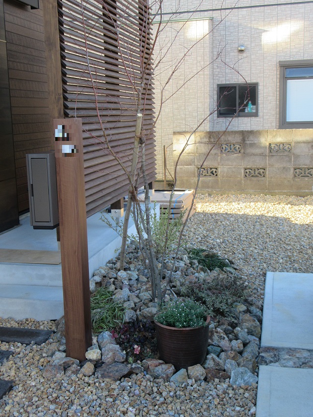 門周り。木調のアルミ柱にポストと表札を取り付けました。表札は文字のみを切り出したものを使用しましたが、写真はモザイク処理してあります。高木はモミジの株立ち。
